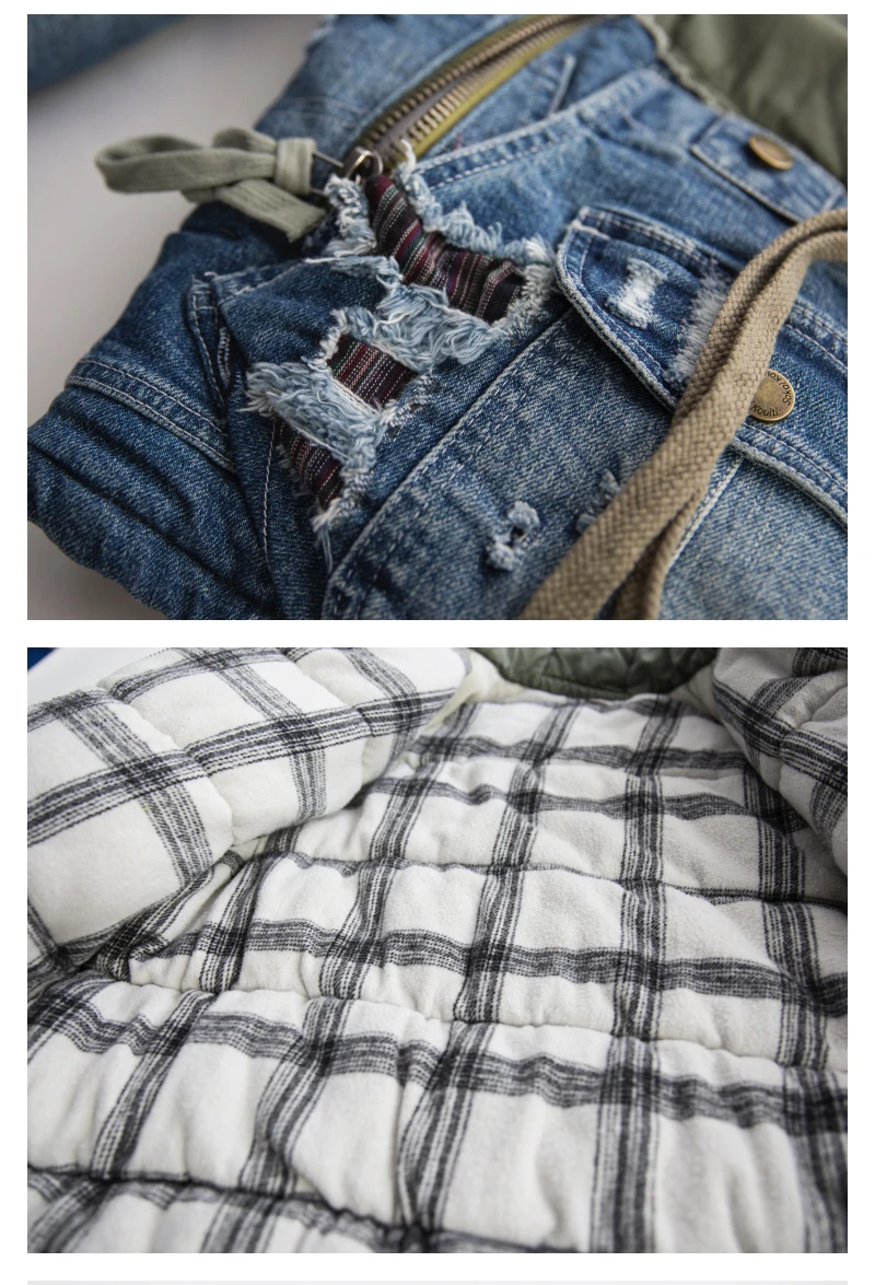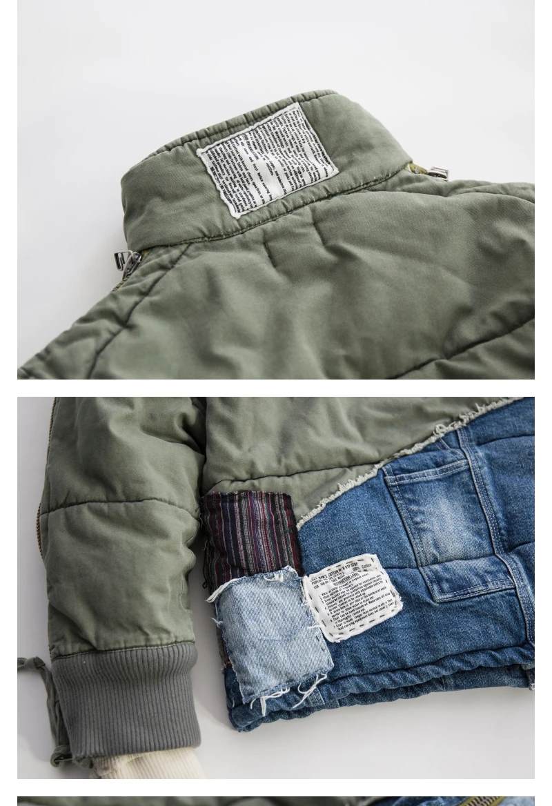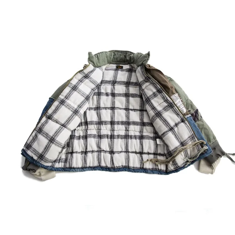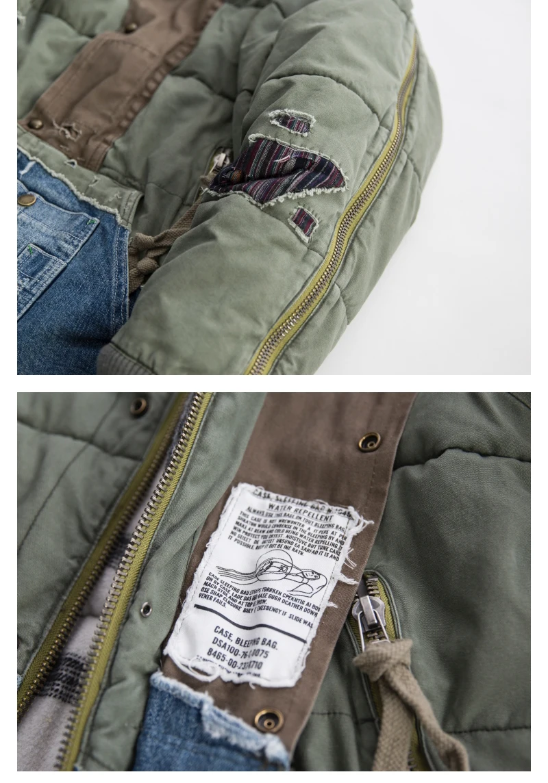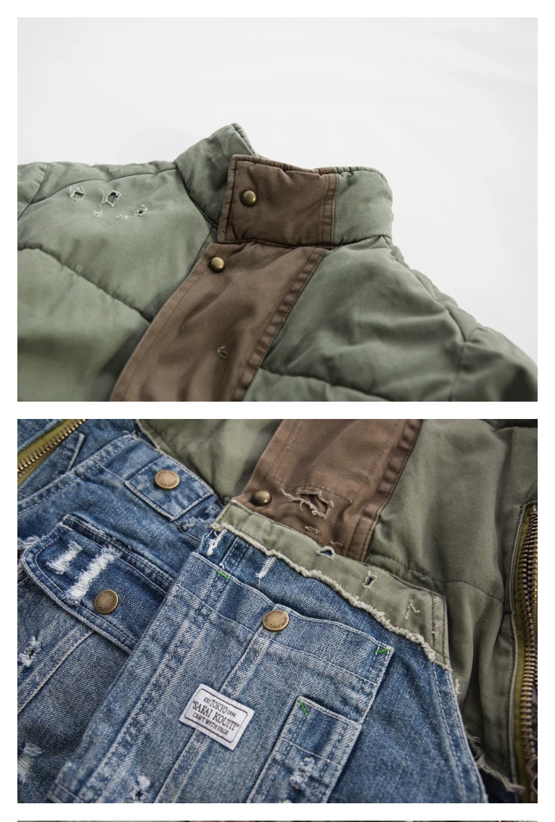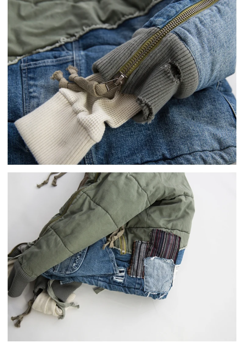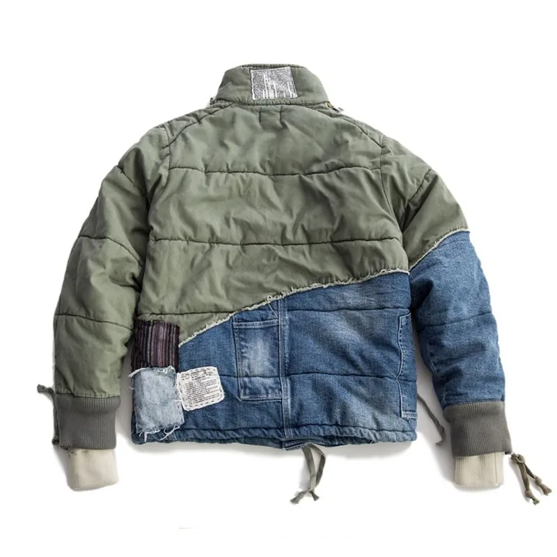 GL Style Men Heavy Industry Washed Distressed Hole Denim Patchwork Cotton Coat Thicken Warm Winter Jacket for Men